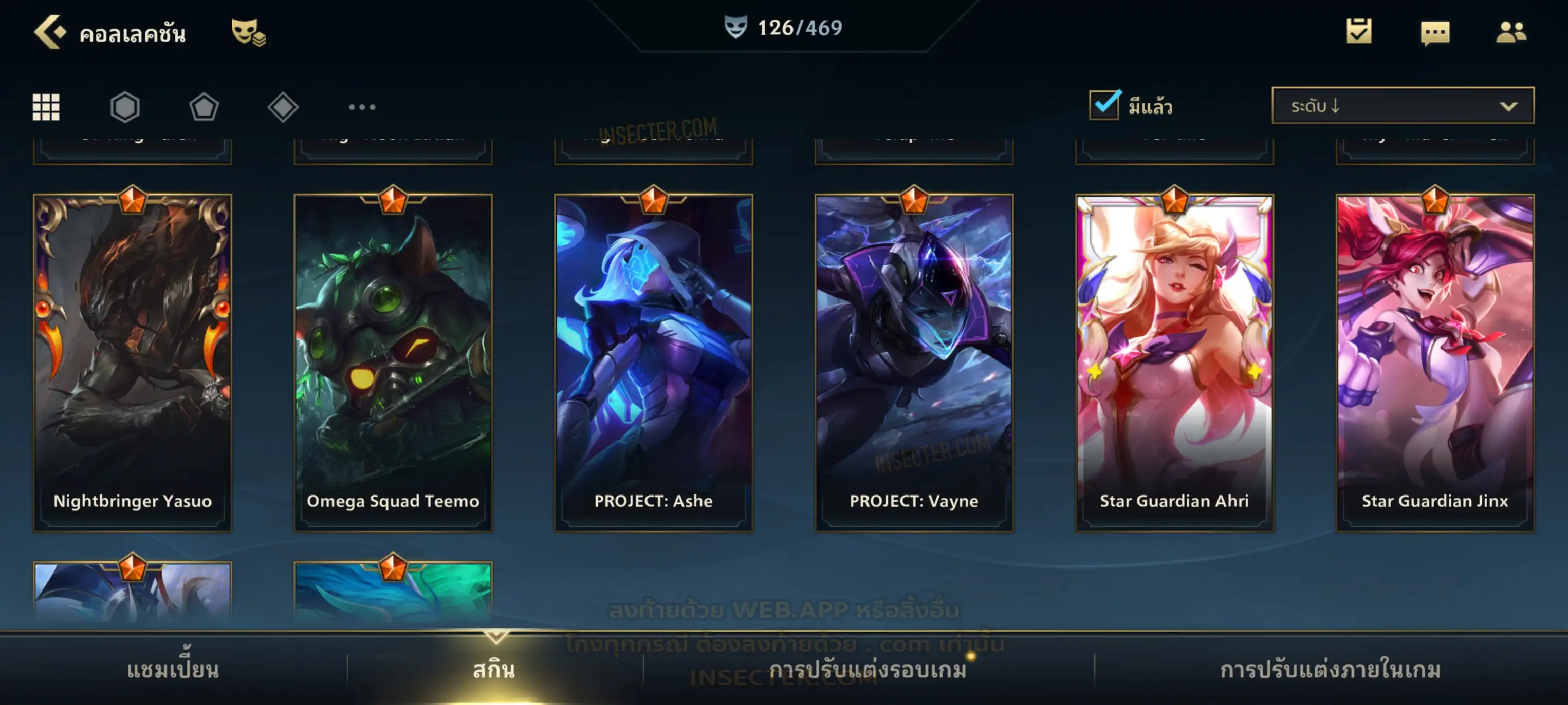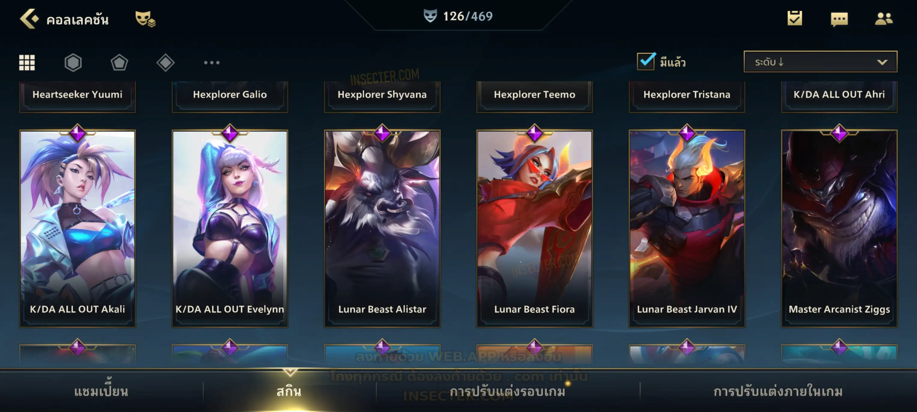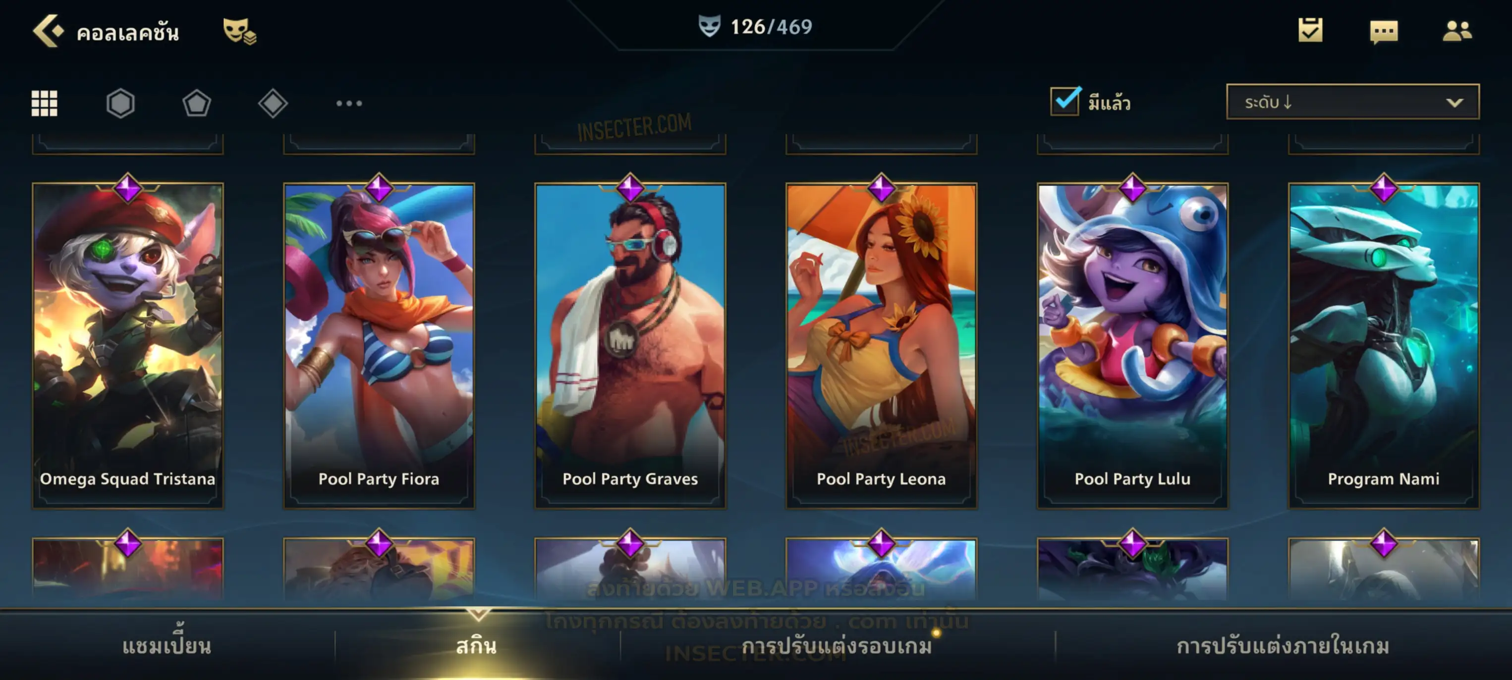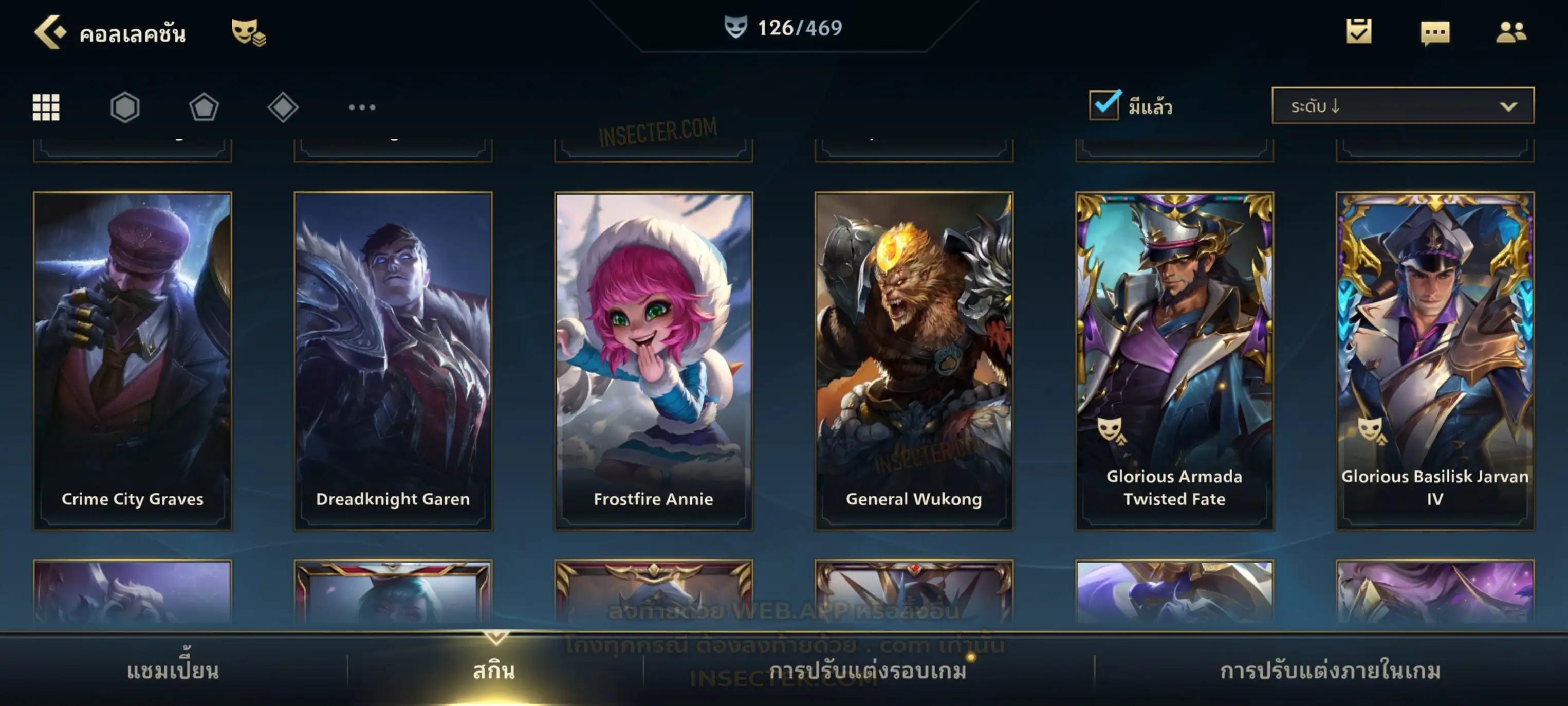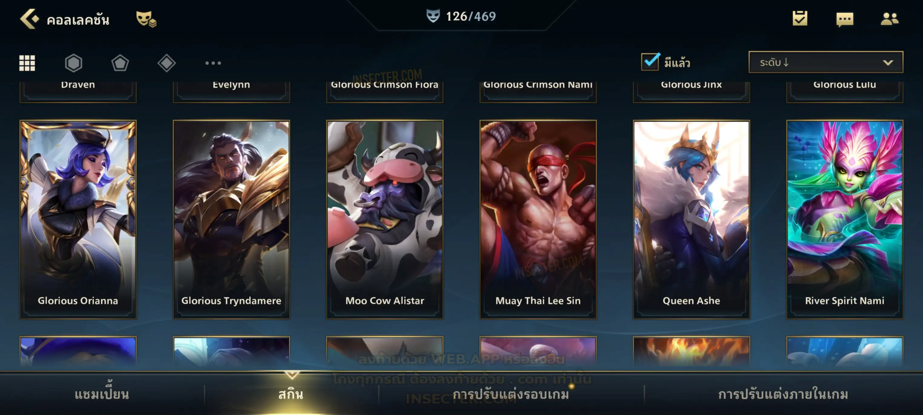 ข้อมูลย่อ : เมน MID-AD-TOP แชมครบของตกแต่งเยอะมีลิมิเต็ด 5 สกินคุ้ม ๆ จ้า ราคา 2,700 บาท 106/106 >แชมเปี้ยน 126 >สกิน 20 >Legendary (กรอบลิมิเต็ด 3 กรอบ) 69 >Epic (กรอบลิมิเต็ด 3 กรอบ+ท่าโพสพิเศษ 3 ท่า) 37 >อื่นๆ (กรอบลิมิเต็ด 6 กรอบ + ท่าโพสพิเศษ 2 ท่า)