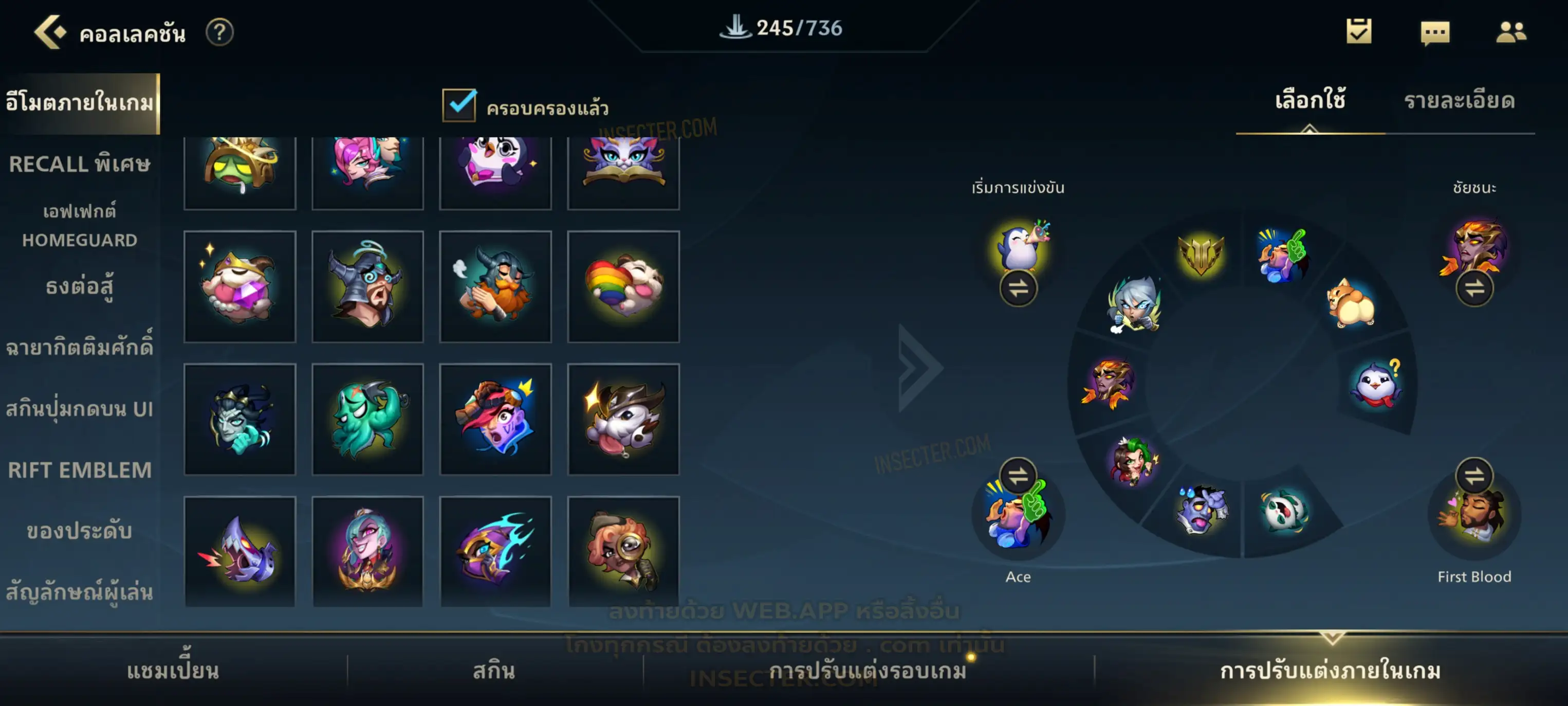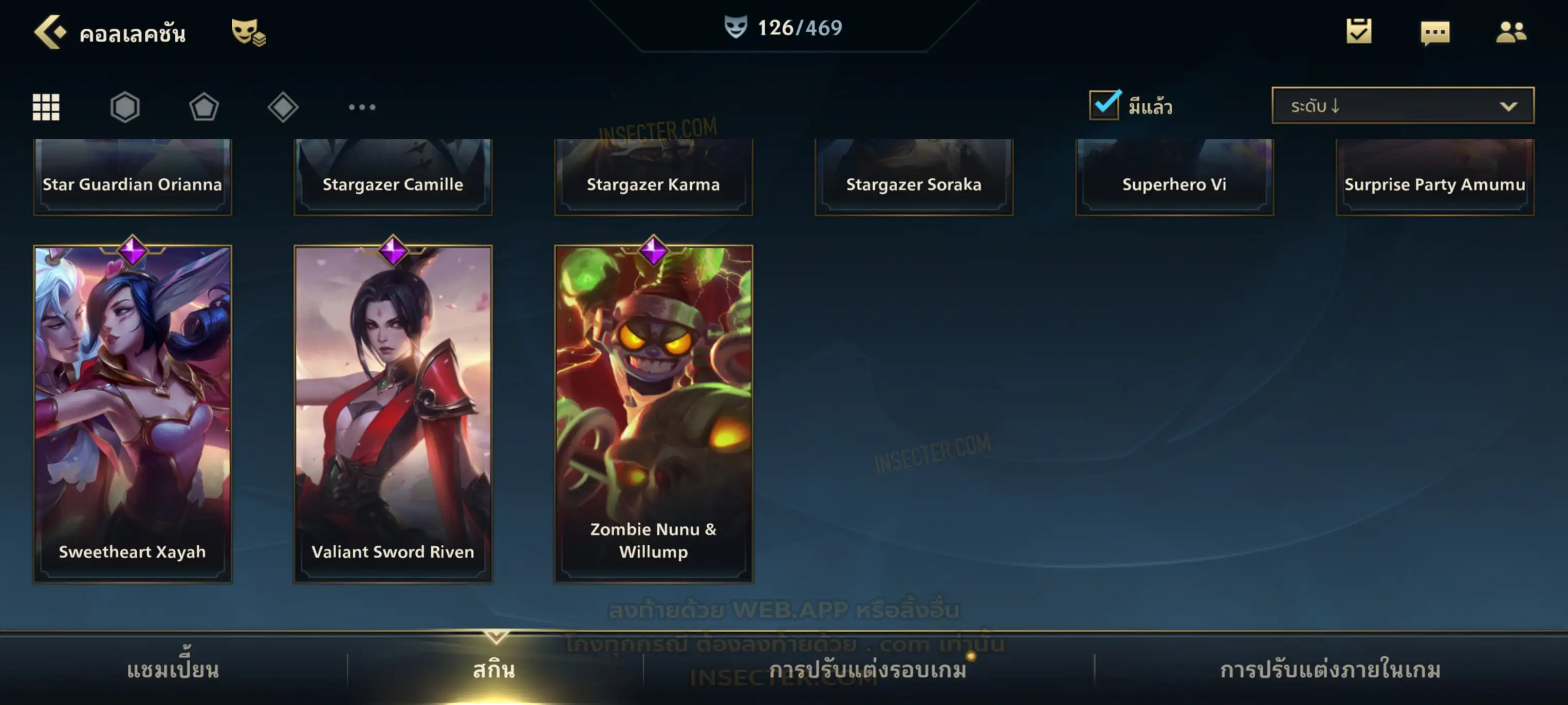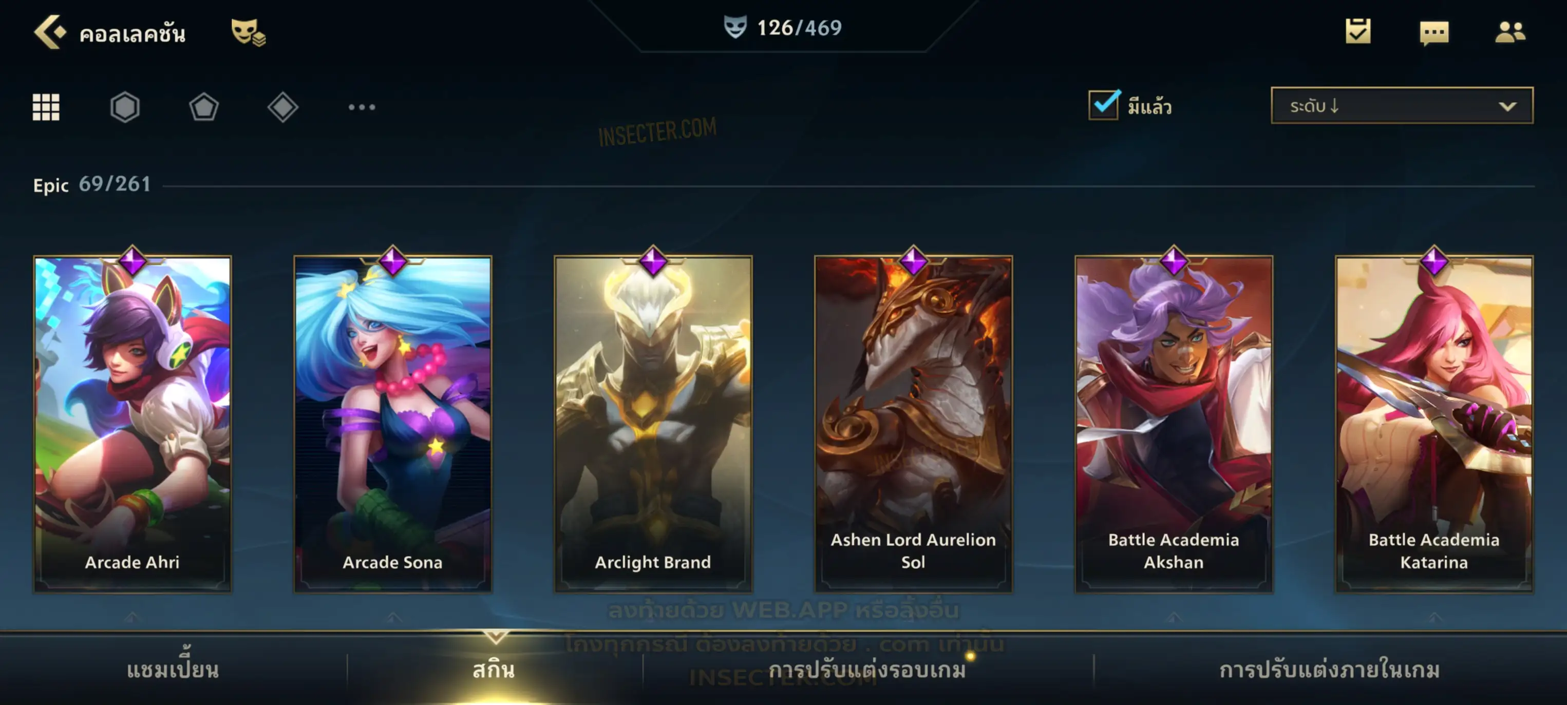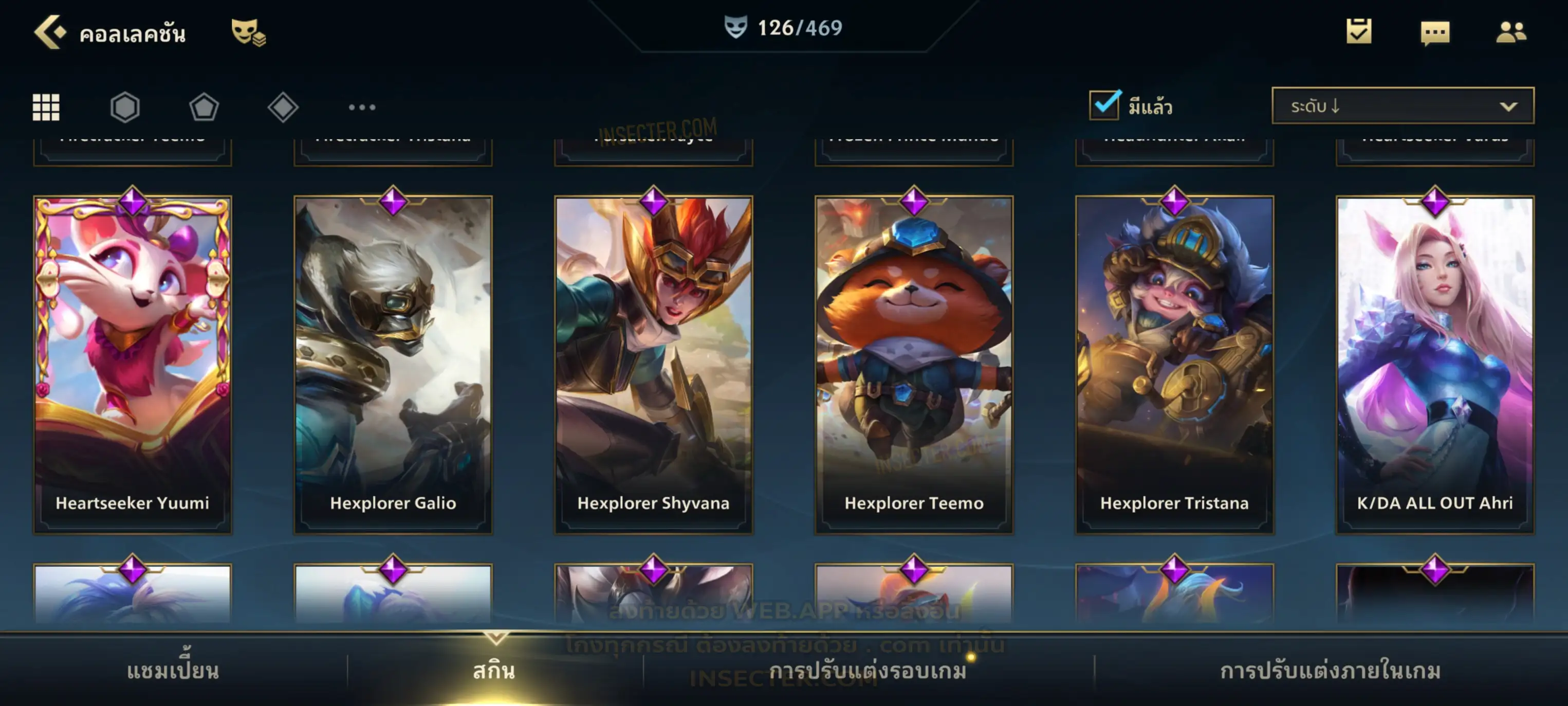ข้อมูลย่อ : เมน MID-AD-TOP แชมครบของตกแต่งเยอะมีลิมิเต็ด 5 สกินคุ้ม ๆ จ้า ราคา 2,700 บาท 106/106 >แชมเปี้ยน 126 >สกิน 20 >Legendary (กรอบลิมิเต็ด 3 กรอบ) 69 >Epic (กรอบลิมิเต็ด 3 กรอบ+ท่าโพสพิเศษ 3 ท่า) 37 >อื่นๆ (กรอบลิมิเต็ด 6 กรอบ + ท่าโพสพิเศษ 2 ท่า)
