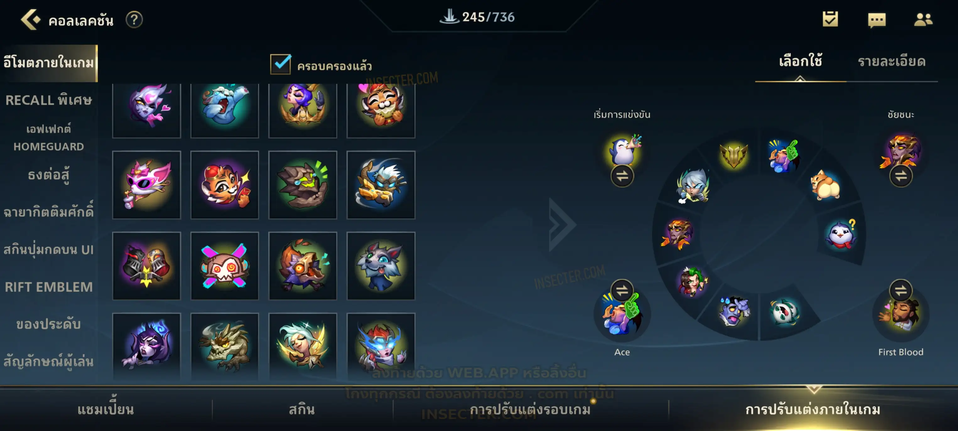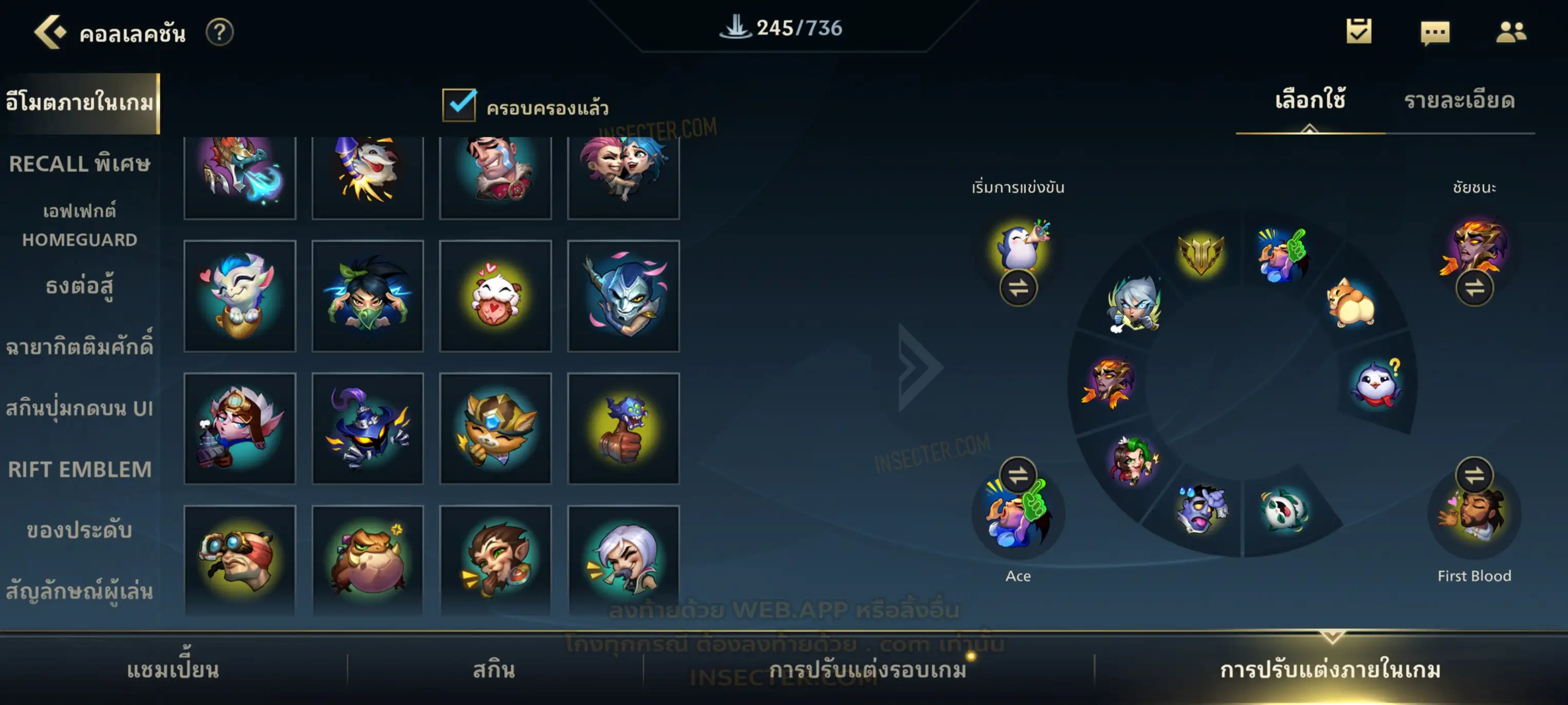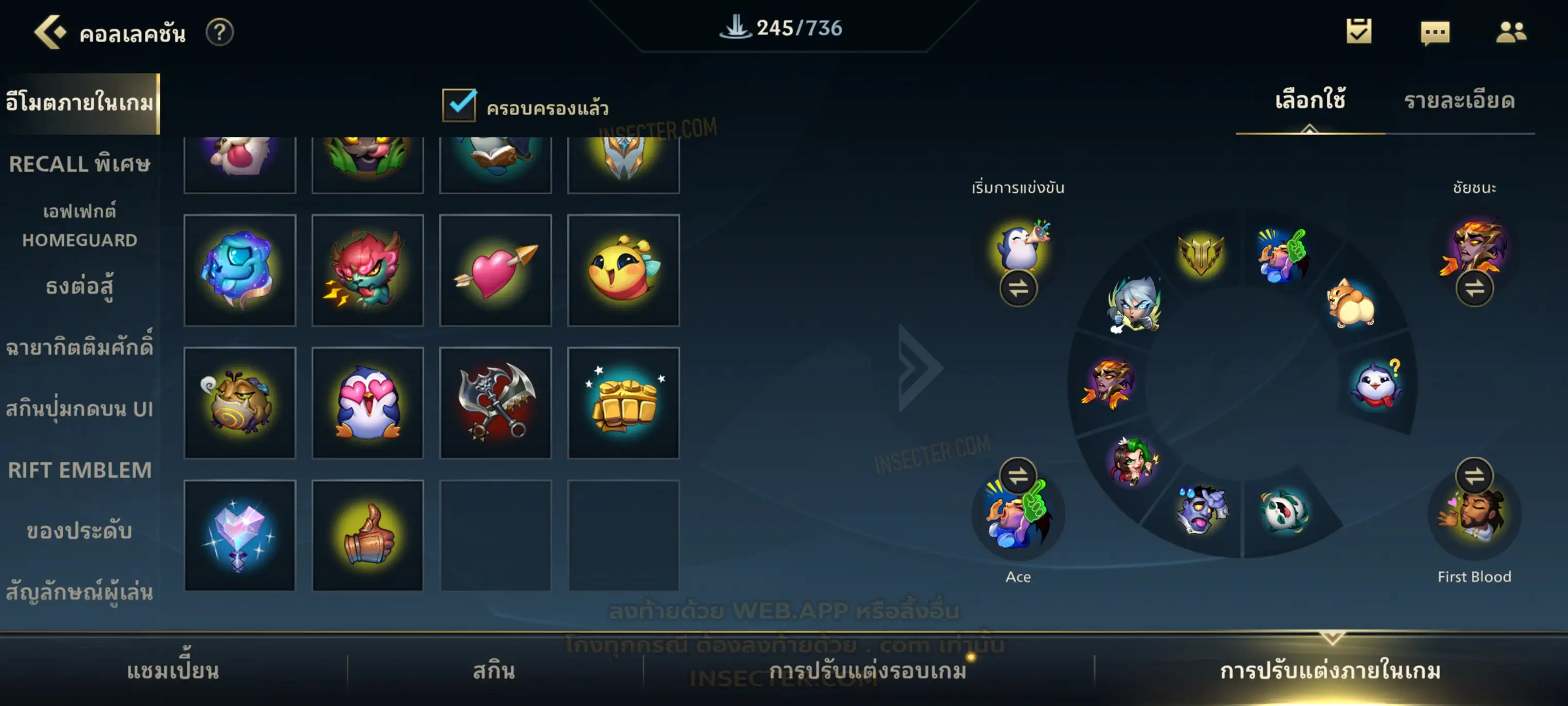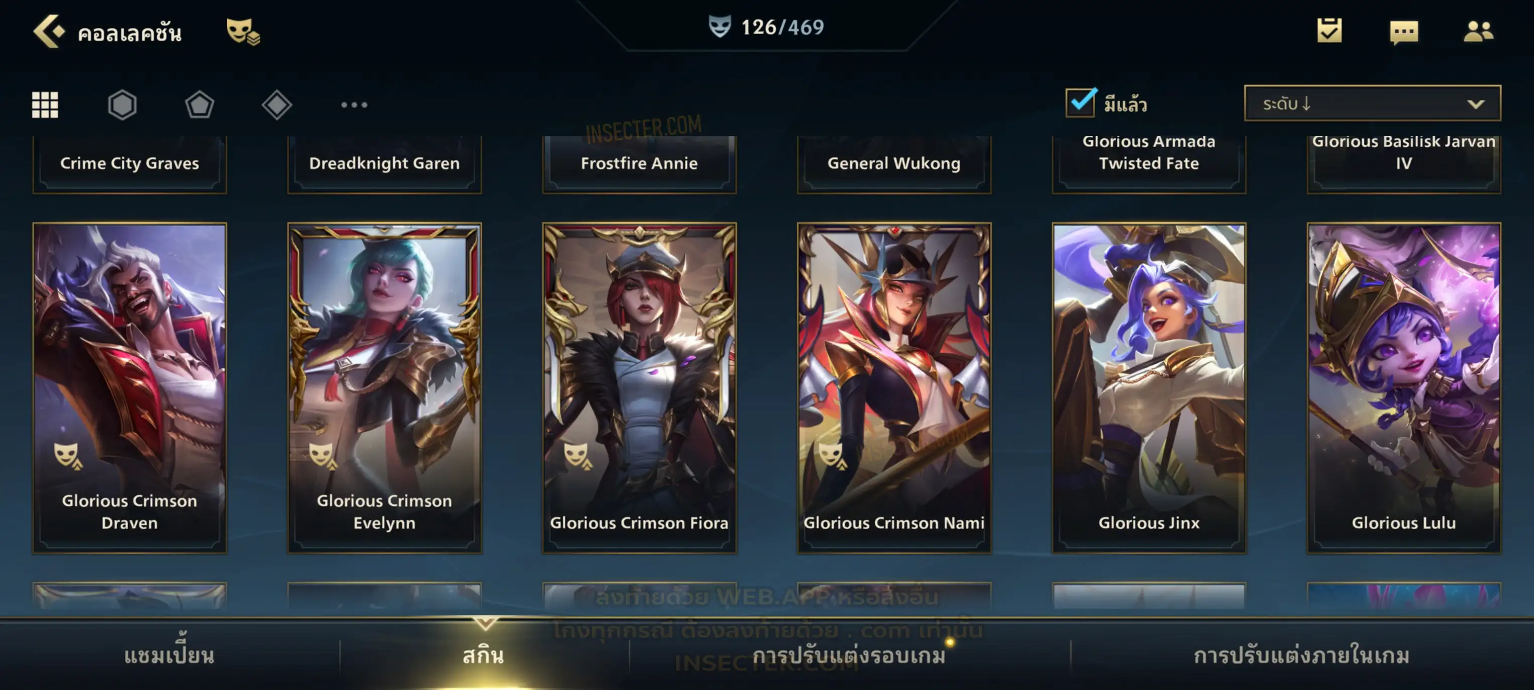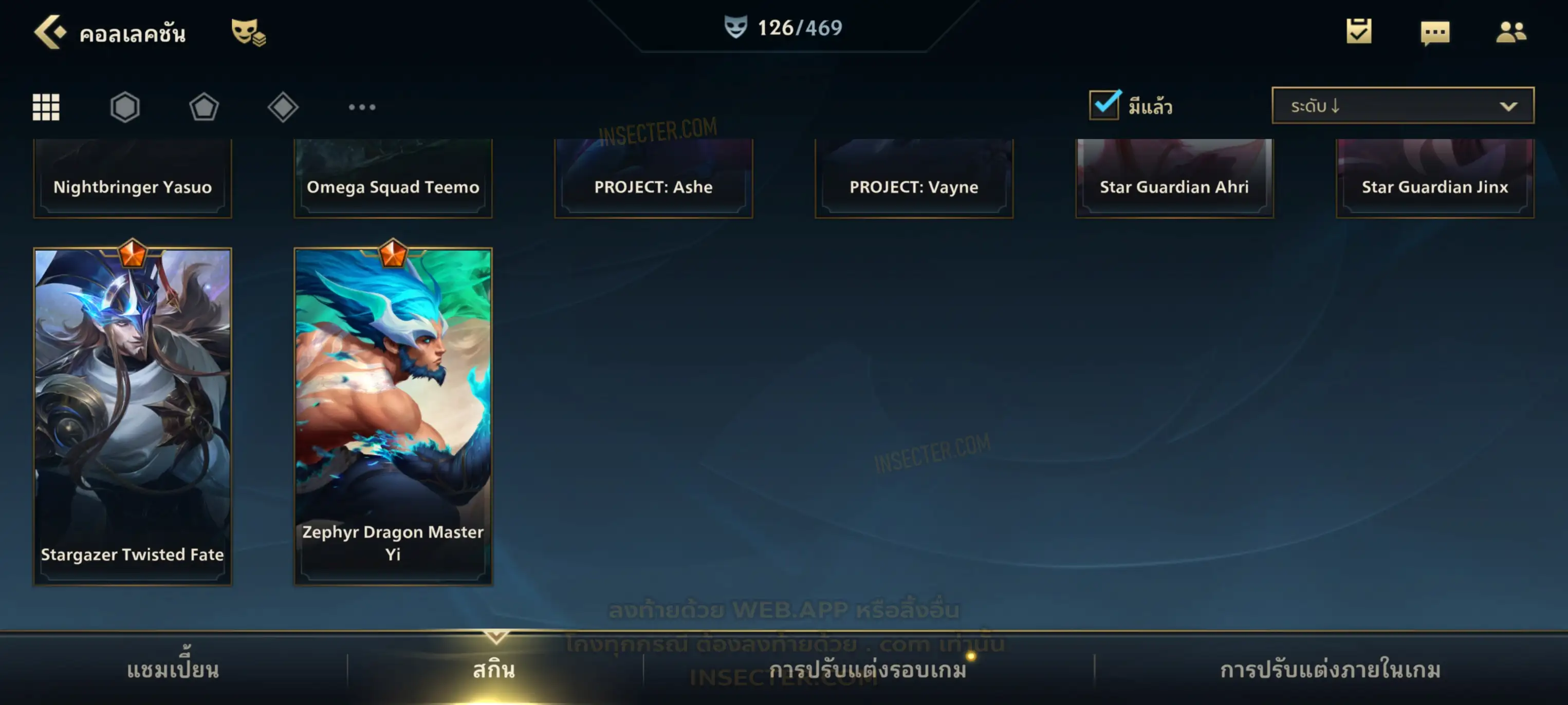 ข้อมูลย่อ : เมน MID-AD-TOP แชมครบของตกแต่งเยอะมีลิมิเต็ด 5 สกินคุ้ม ๆ จ้า ราคา 2,700 บาท 106/106 >แชมเปี้ยน 126 >สกิน 20 >Legendary (กรอบลิมิเต็ด 3 กรอบ) 69 >Epic (กรอบลิมิเต็ด 3 กรอบ+ท่าโพสพิเศษ 3 ท่า) 37 >อื่นๆ (กรอบลิมิเต็ด 6 กรอบ + ท่าโพสพิเศษ 2 ท่า)