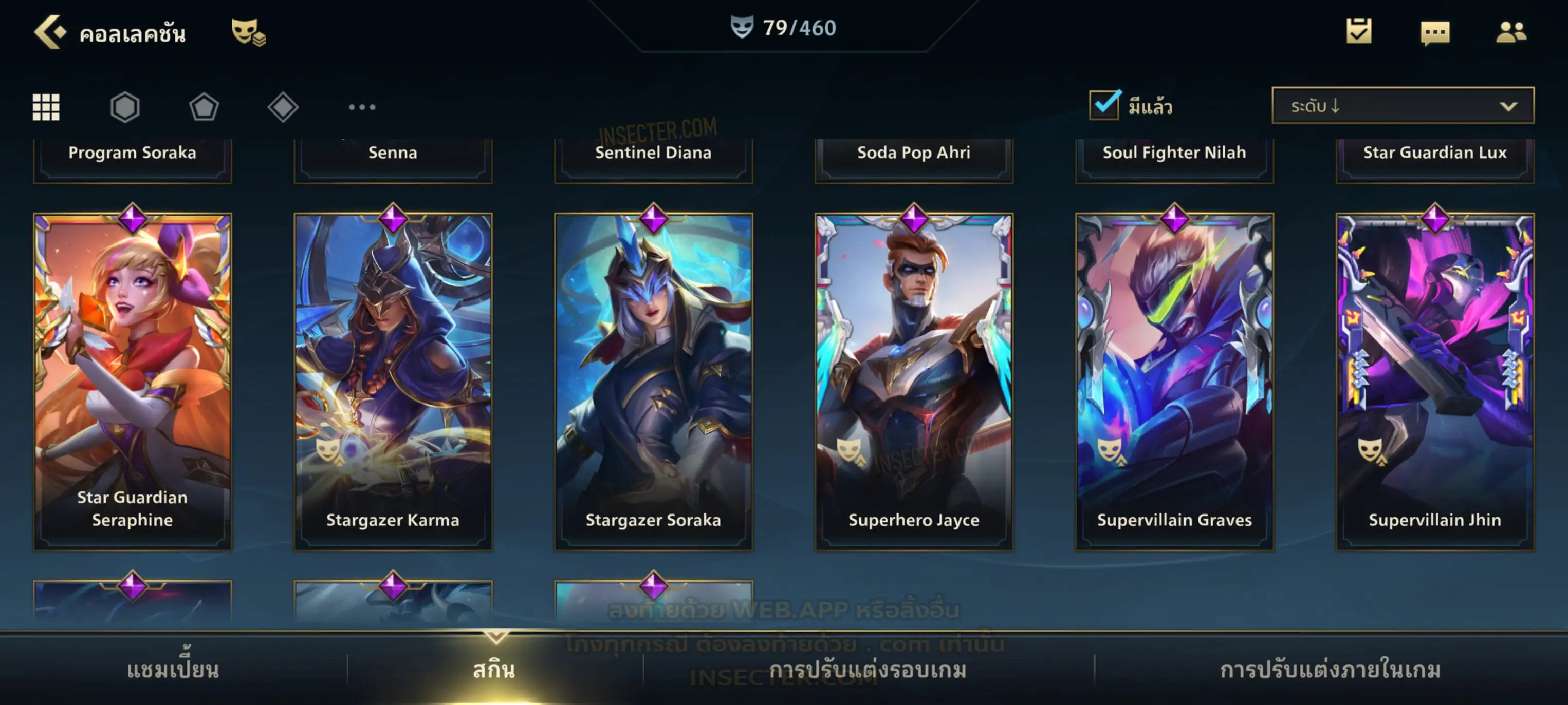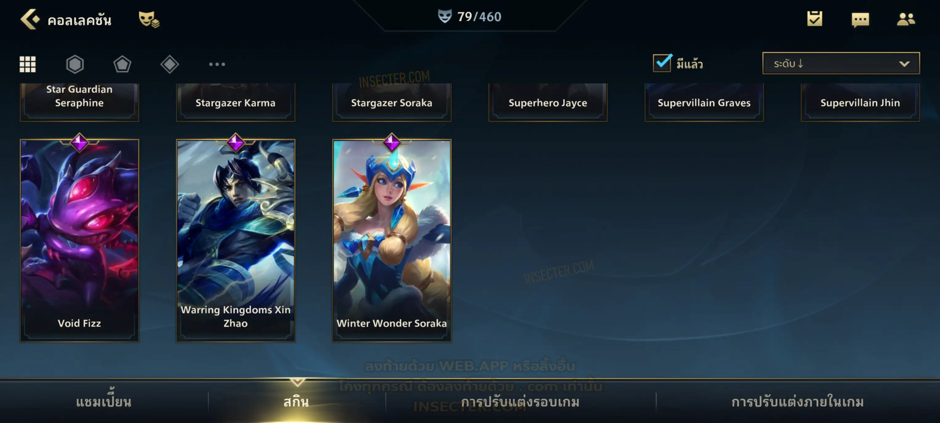 ข้อมูลย่อ : เมน MID-SUP-AD แชมเยอะ เน้นสกินผู้หญิงสวย ๆ คุ้ม ๆ เลยจ้า 96/105 >แชมเปี้ยน 79 >สกิน 7 >Legendary (กรอบลิมิเต็ด 2 กรอบ+ท่าโพสพิเศษ 2 ท่า '' เป็นแบบกดในเกมได้ 1ท่า '') 45 >Epic (กรอบลิมิเต็ด 6 กรอบ+ท่าโพสพิเศษ 3 ท่า) 27 >อื่นๆ (กรอบลิมิเต็ด 7 กรอบ+ท่าโพสพิเศษ 2 ท่า)