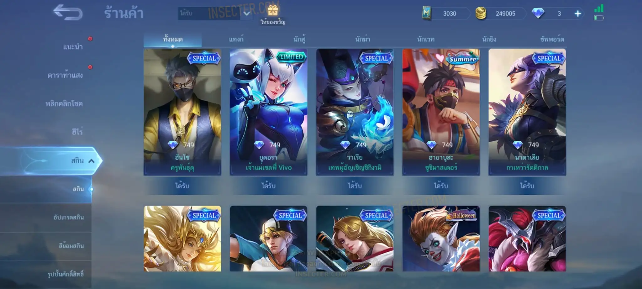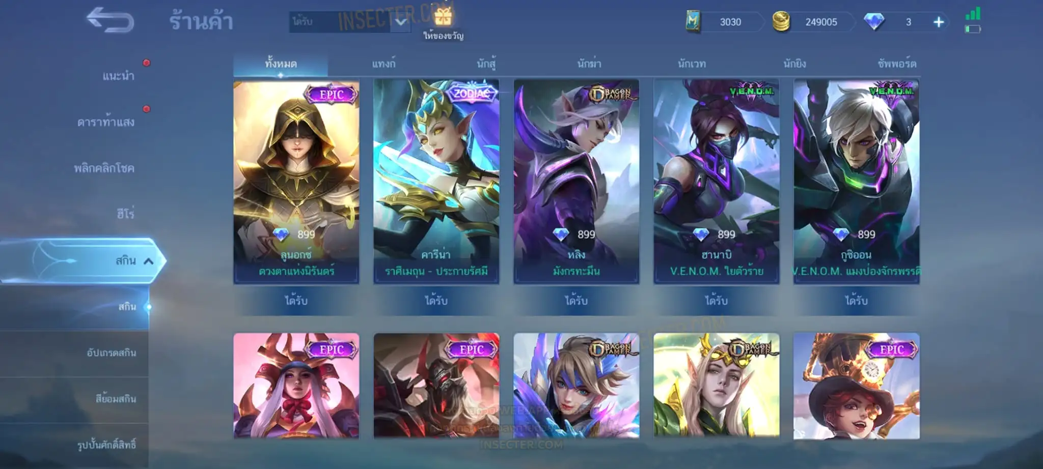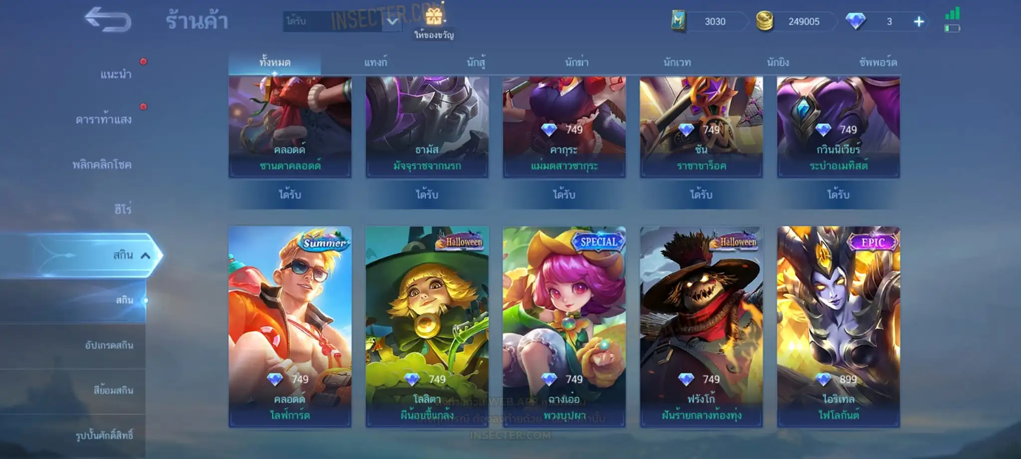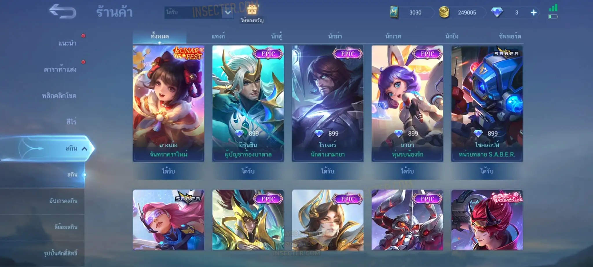 ข้อมูลย่อ : Hero 122 Skin 508 เอ็มเบลตัน/วาร์ปแรร์ มงกุฎไฟ Epic ถาวร และอื่นๆ !!! ตั๋ว 3,000 ทอง 249,000 Legend 5 ตัว Collector 4 ตัว อนิเมะ 20 ตัว Zodiac 13 ตัว (ครบ) !!! Epic ธรรมดา/แรร์ 30 ตัว Special ธรรมดา/แรร์ 48 ตัว Ster/Champion/MSC/Luner/Christmas/Valentine/Halloween/515/AS/MDI/Create/ Limited 42 ตัว ถ่ายมาบางส่วนยังไม่รวม Elite/Season/Ster คอลเลคชั่นอื่นๆ