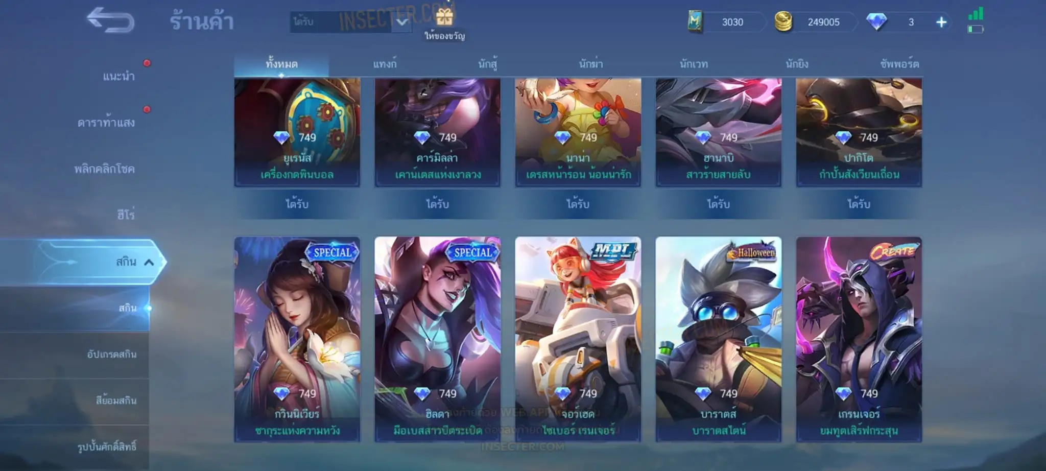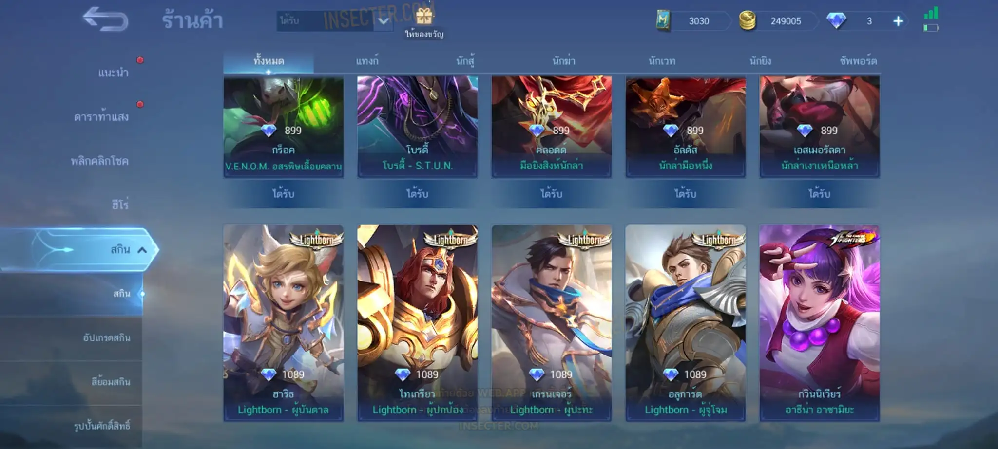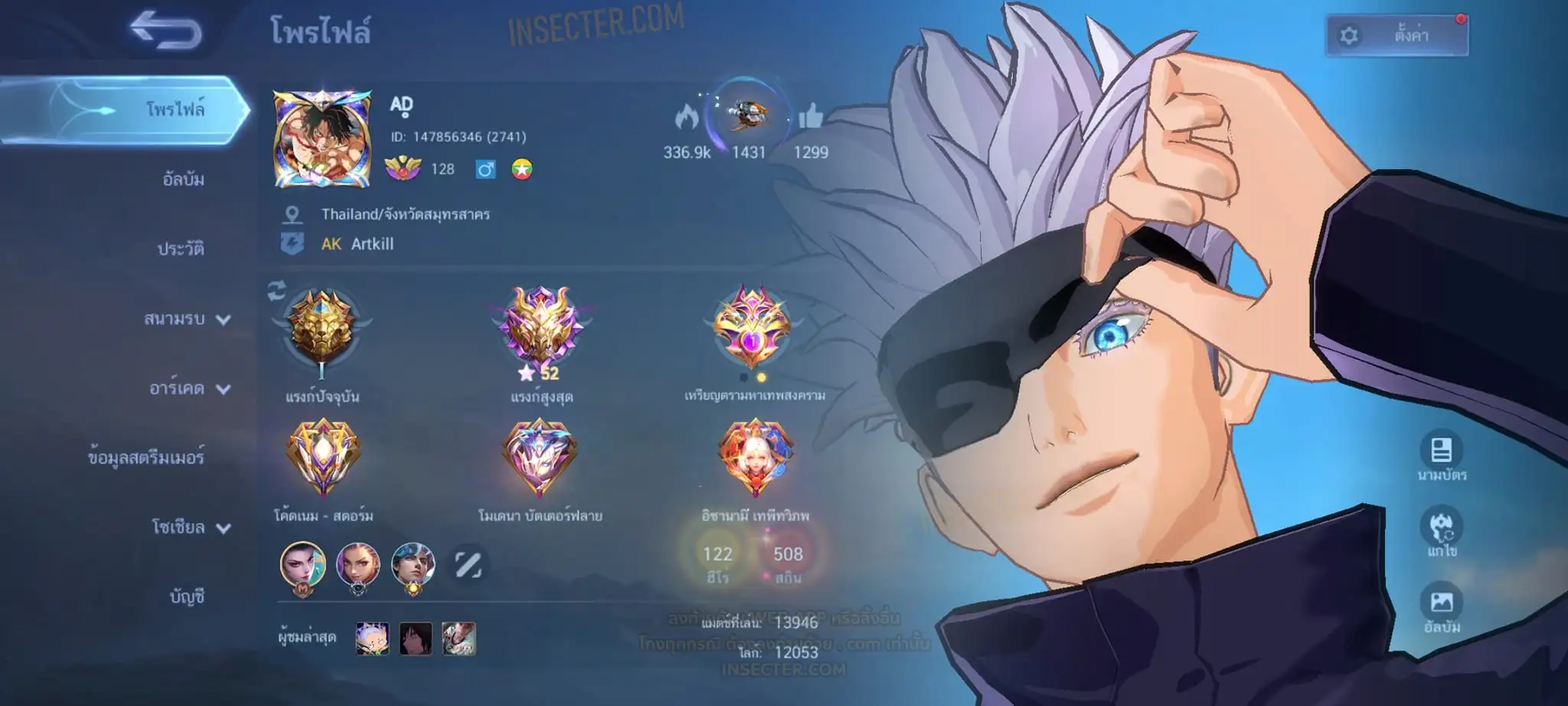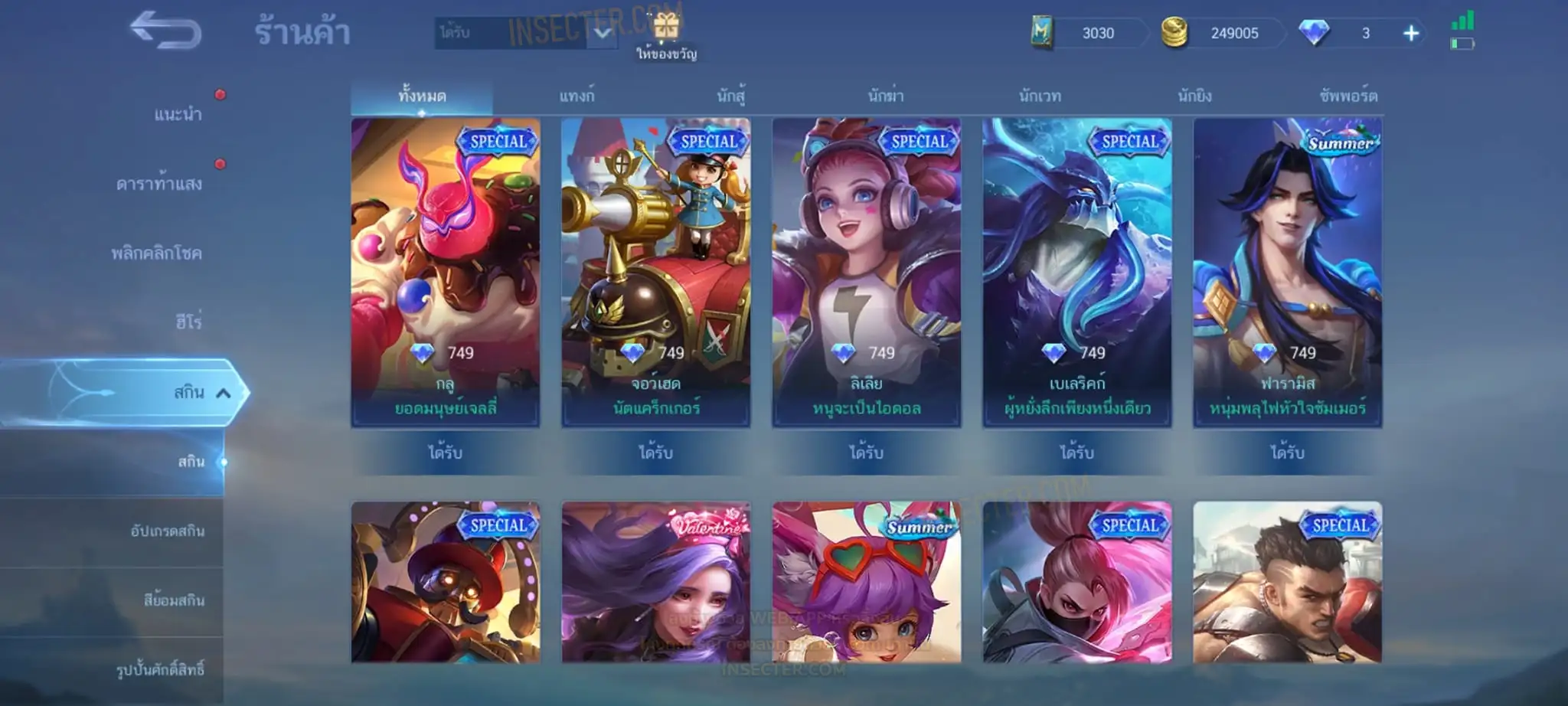 ข้อมูลย่อ : Hero 122 Skin 508 เอ็มเบลตัน/วาร์ปแรร์ มงกุฎไฟ Epic ถาวร และอื่นๆ !!! ตั๋ว 3,000 ทอง 249,000 Legend 5 ตัว Collector 4 ตัว อนิเมะ 20 ตัว Zodiac 13 ตัว (ครบ) !!! Epic ธรรมดา/แรร์ 30 ตัว Special ธรรมดา/แรร์ 48 ตัว Ster/Champion/MSC/Luner/Christmas/Valentine/Halloween/515/AS/MDI/Create/ Limited 42 ตัว ถ่ายมาบางส่วนยังไม่รวม Elite/Season/Ster คอลเลคชั่นอื่นๆ