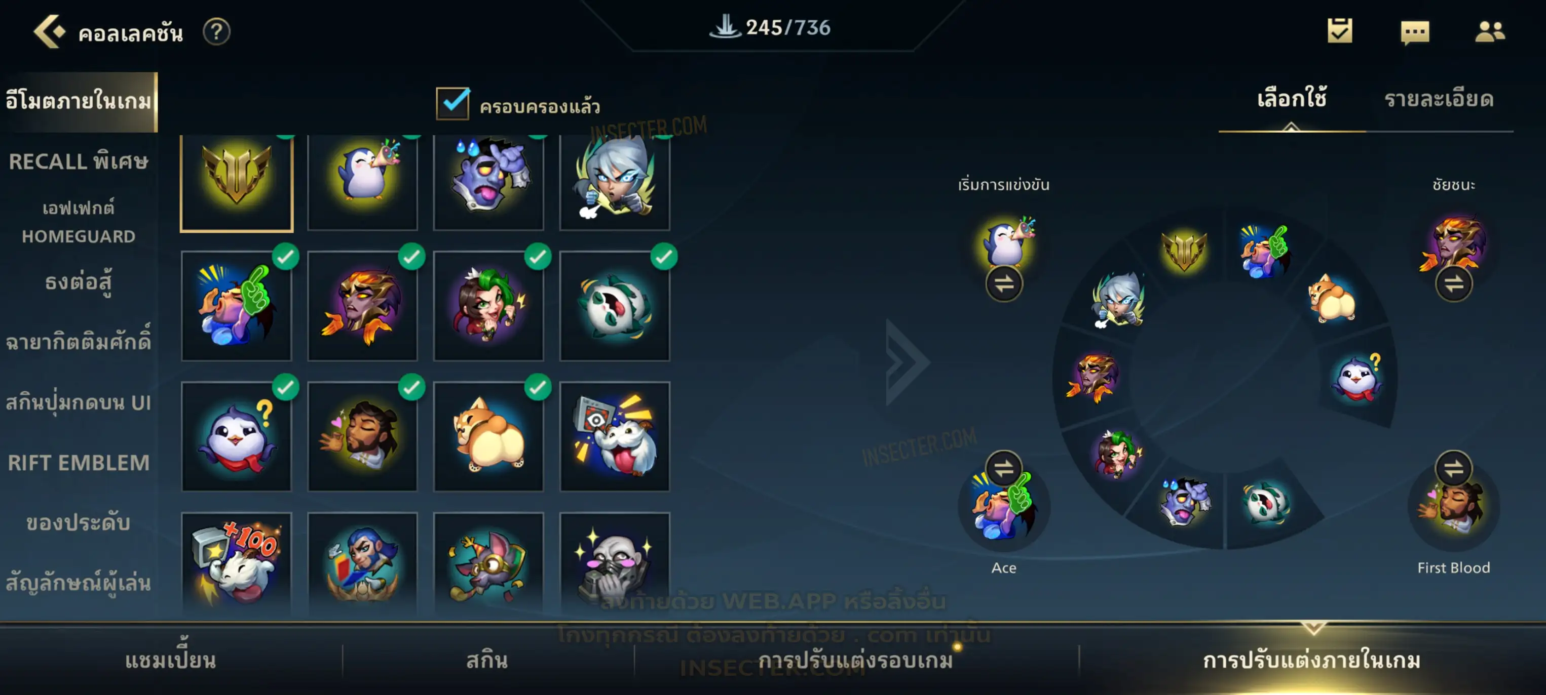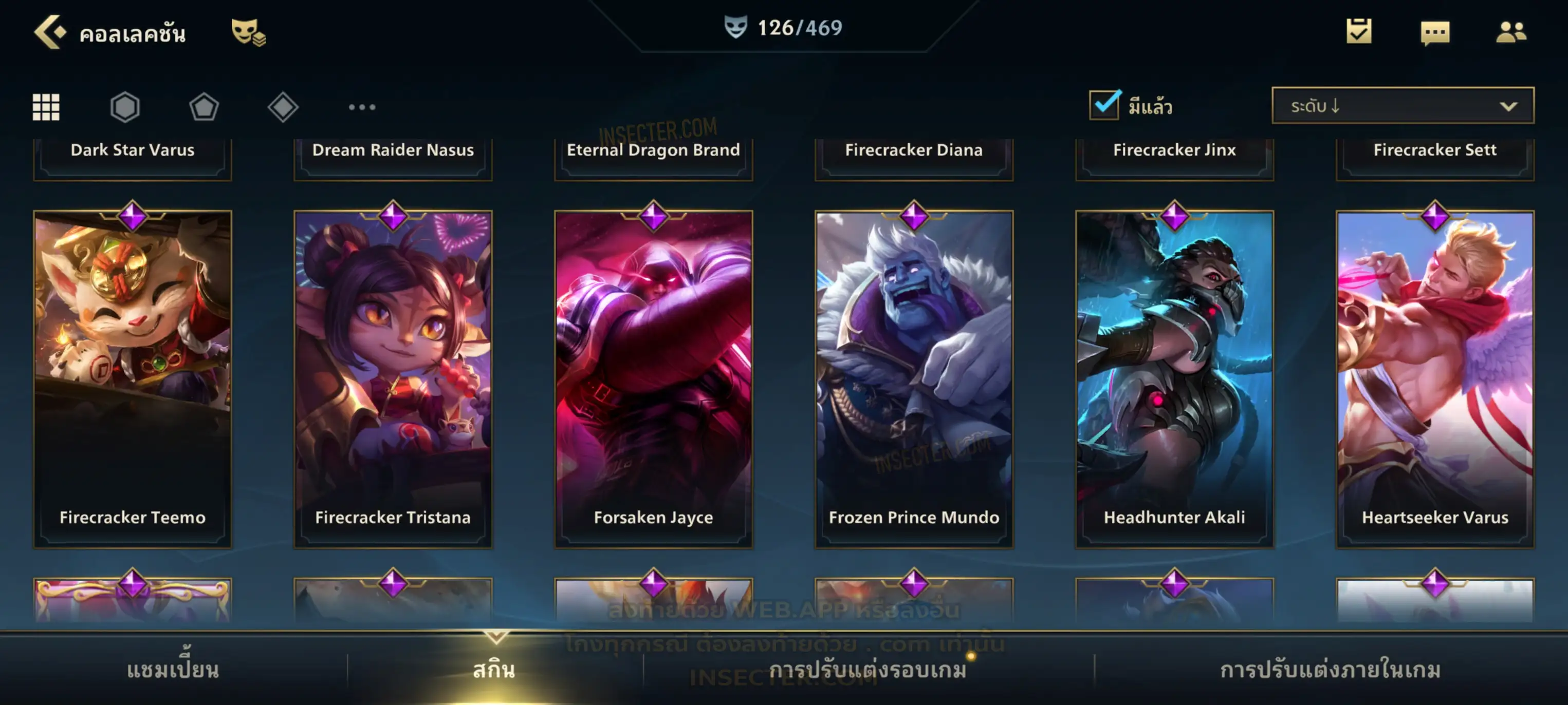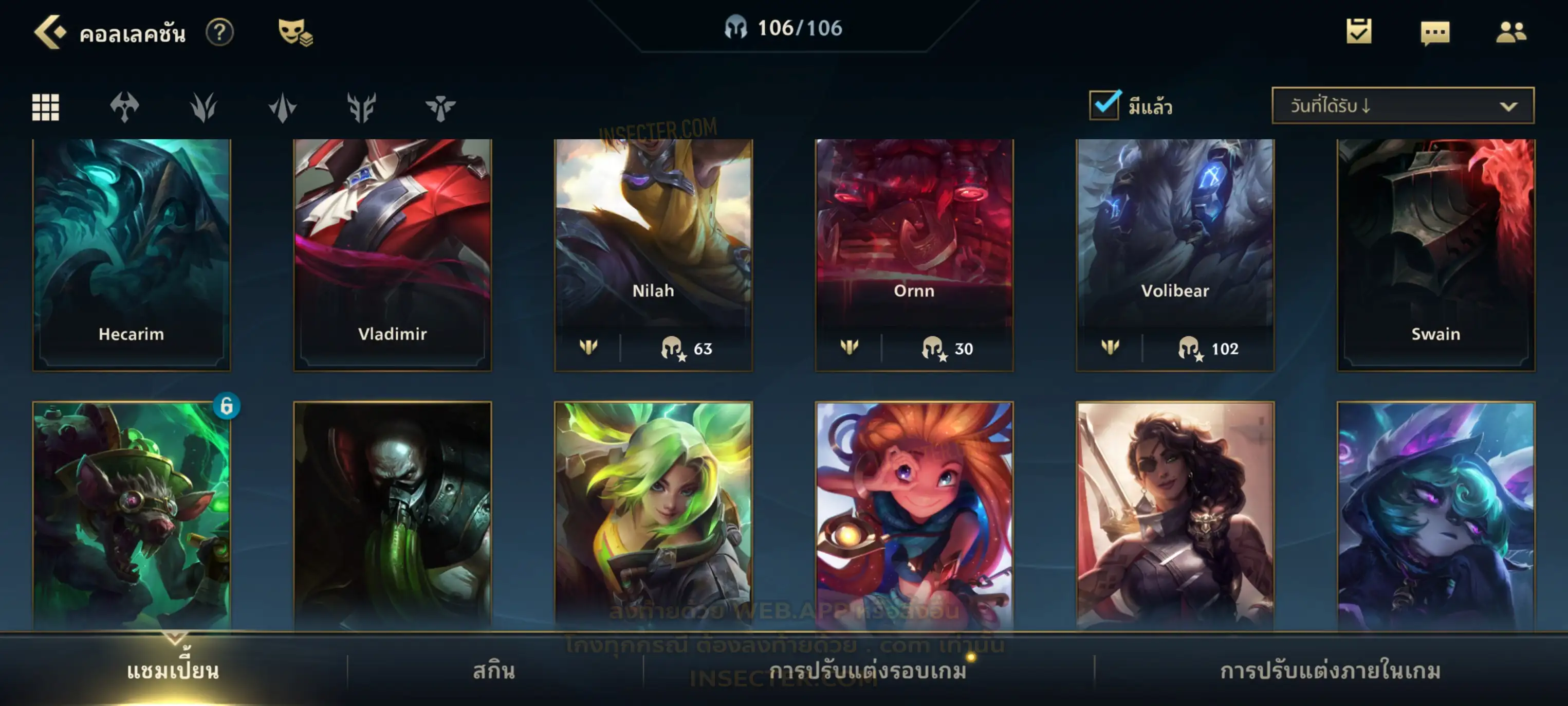 ข้อมูลย่อ : เมน MID-AD-TOP แชมครบของตกแต่งเยอะมีลิมิเต็ด 5 สกินคุ้ม ๆ จ้า ราคา 2,700 บาท 106/106 >แชมเปี้ยน 126 >สกิน 20 >Legendary (กรอบลิมิเต็ด 3 กรอบ) 69 >Epic (กรอบลิมิเต็ด 3 กรอบ+ท่าโพสพิเศษ 3 ท่า) 37 >อื่นๆ (กรอบลิมิเต็ด 6 กรอบ + ท่าโพสพิเศษ 2 ท่า)